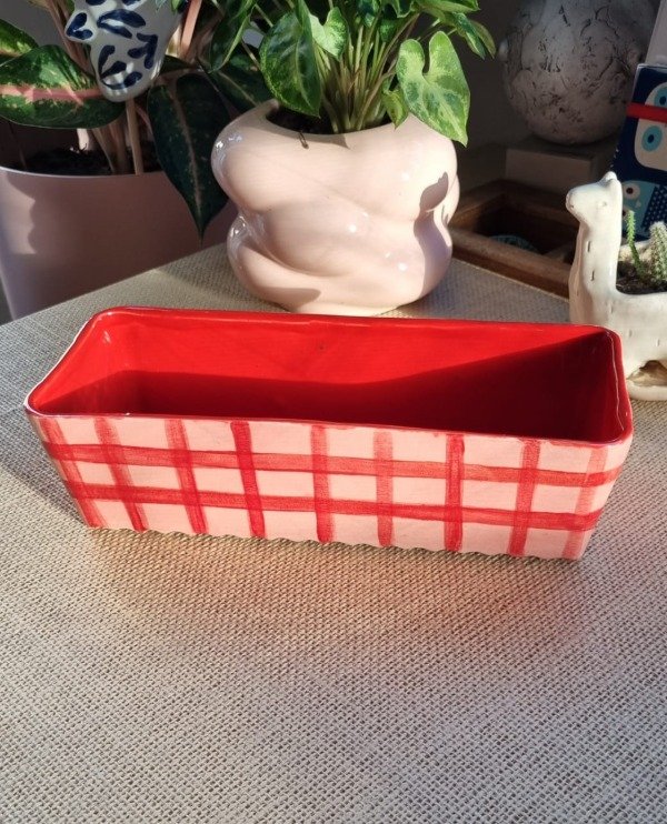 Budinera de cerámica hecha y pintada a mano. Pieza única, diseñada en cuadrillé rojo sobre fondo rosa.
