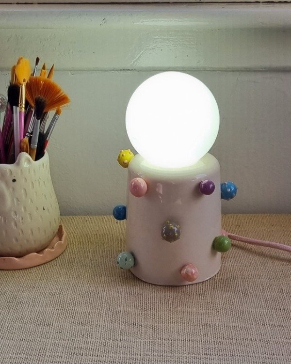 Hermosa y original lámpara de diseño, hecha a mano en cerámica, con globo de vídrio en tono ópalo. Cable en color rosa . Única. Ilumina y decora tus ambientes