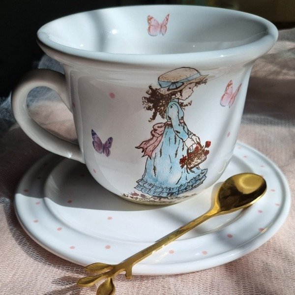 Set de de taza y platito línea Sarah hecha en cerámica blanca pintada a mano con técnica y pigmentos de pintura en porcelana.. Se pueden realizar a pedido con otros motivos y tonalidades.