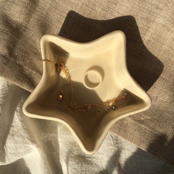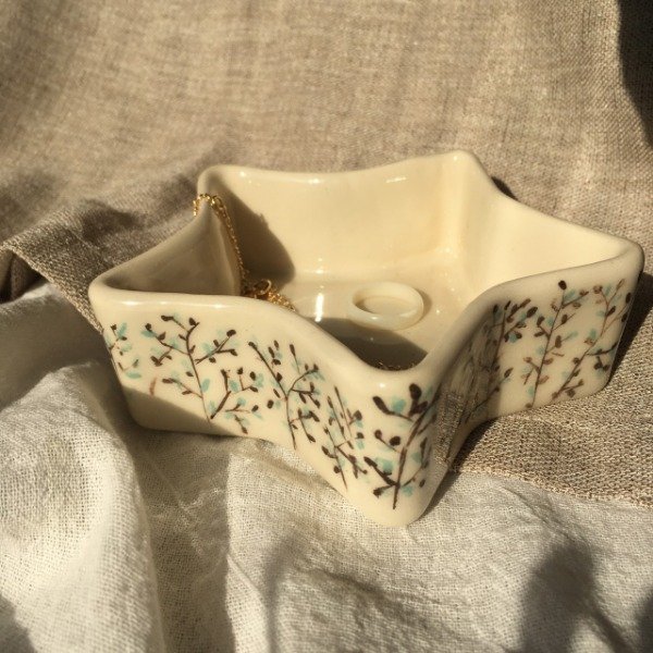 Bowl hecho a mano en forma de estrella, en ceramica blanca, con pequeñas florcitas pintadas a mano. Podes usarlo para comida o como alhajero :)