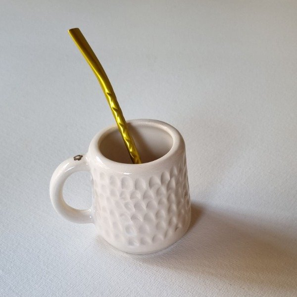Mate de cerámica blanca hecho a mano con esgrafiado y detalle de oro en el asa. Acompañado de bombilla dorada :)