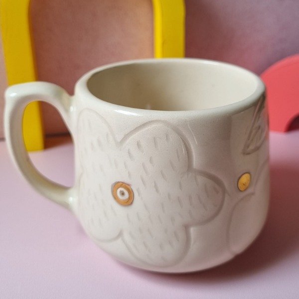 Taza de diseño en cerámica hecha a mano con técnica de esgrafiado con detalles en oro, color natural. No apta microondas.