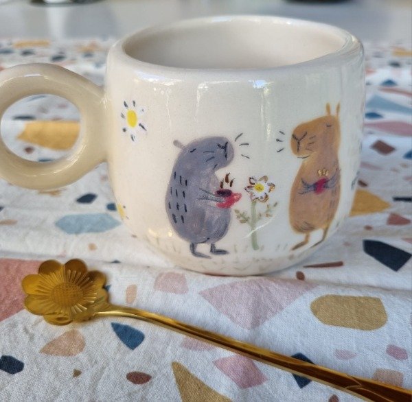 Hermosa taza de diseño realizada y pintada a mano en cerámica. Con detalles en oro por lo que no es apta microondas. PIEZA ÚNICA. Los Tutticapybaras son piezas originales de nuestro emprendimiento pensadas con el corazón.