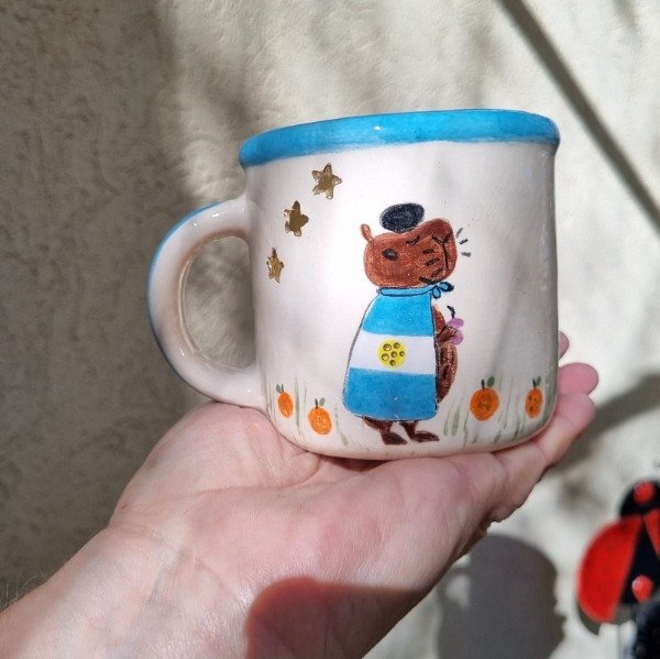 Hermoso jarrito realizado y pintado a mano en cerámica. Este Tutticapybara es una original pieza que solo encontrarás aquí. Contiene muchos detalles en oro lo que lo hace no apta para uso en microondas.