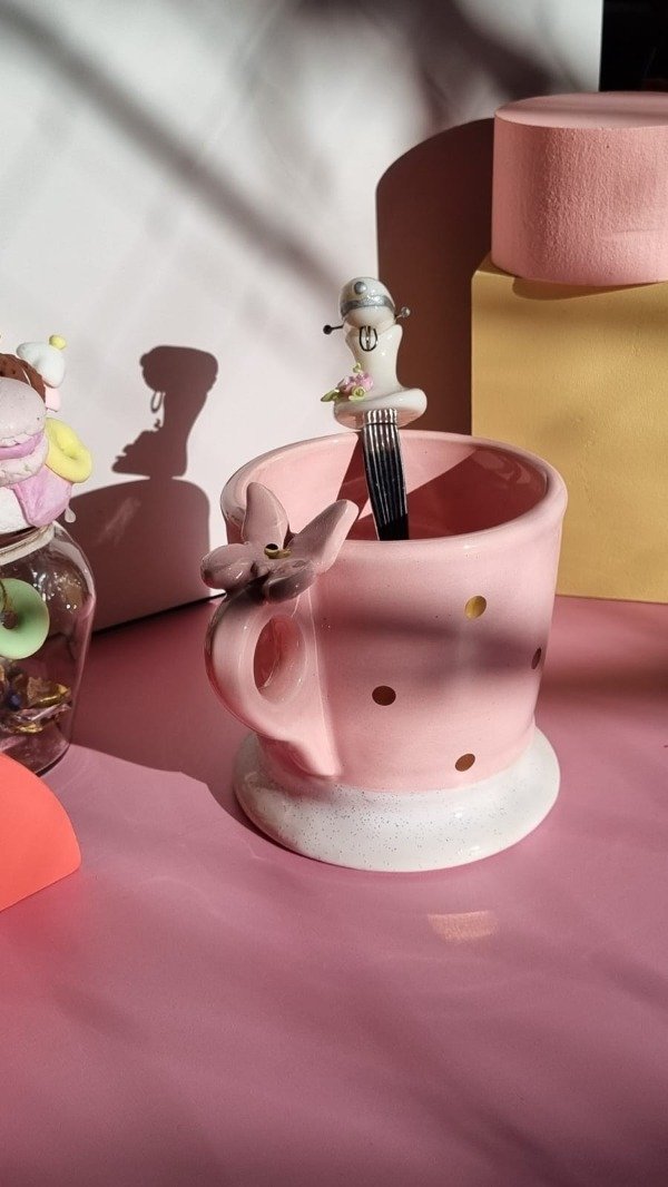 Taza de cerámica hecha a mano con detalle de mariposa en su agarre. Color rosa con lunares en dorado.