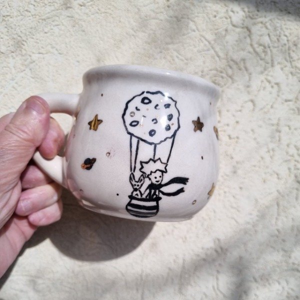 Taza hecha a mano en cerámica de baja temperatura. Pintada a mano. Modelo El principito en blanco y negro con detalles en oro. Pieza única. No apta microondas.